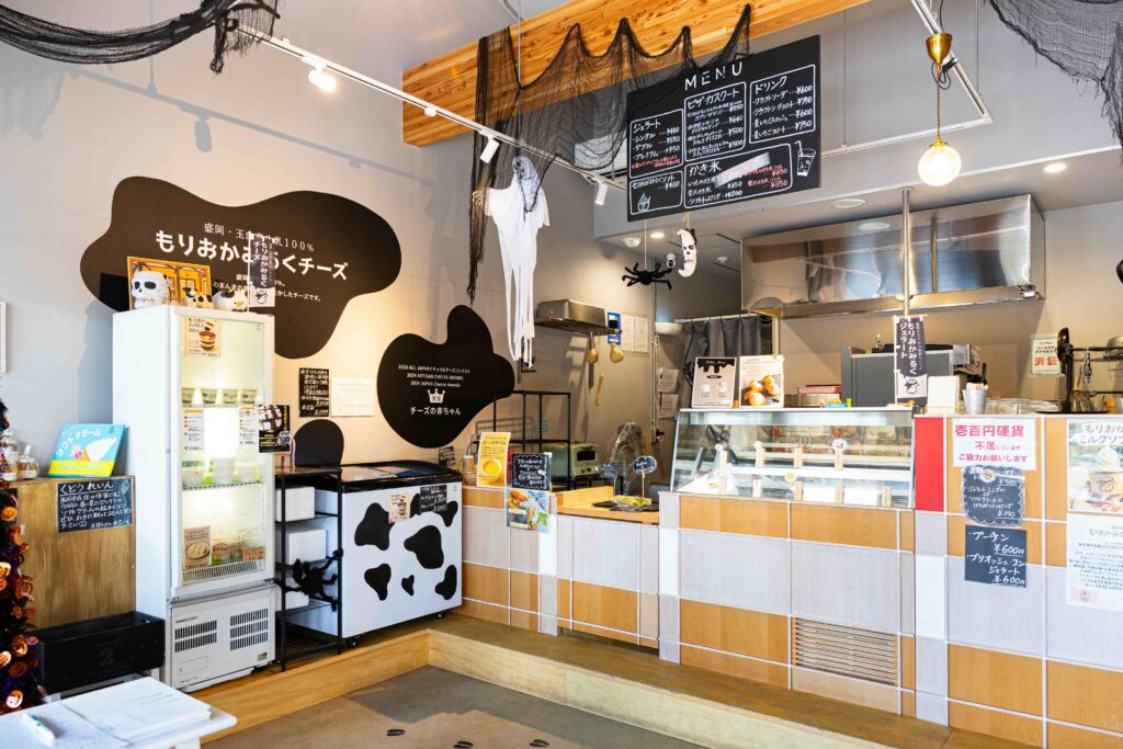 道の駅と聞いて、多くの方が思い浮かべるのは “ご当地アイス”ではないでしょうか。そのイメージをまっすぐに体現しながら、ここにしかない独創的な味を日々生み出しているのが「もりおかみるくステーション」です。店内は、少し石造り調の壁が印象的。昔の牛小屋のような、どこか暗くひんやりとした雰囲気と、外国の古いチーズ屋さんのイメージを重ね合わせた、落ち着いた佇まいが訪れる人を迎えます。