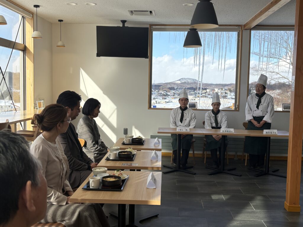 1月22日(水)には、たみっと啄木亭にてお披露目会が開催され、盛岡市の小原副市長、菜園調理師専門学校の及川校長、そして料理研究家で、たみっとのBON JEWELのオーナーでもある晴澤さんのお三方が試食講評をし、どちらのメニューもとても高評価で、生徒さんたちもとても嬉しそうでした。