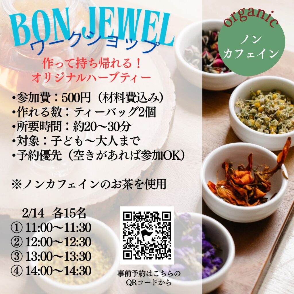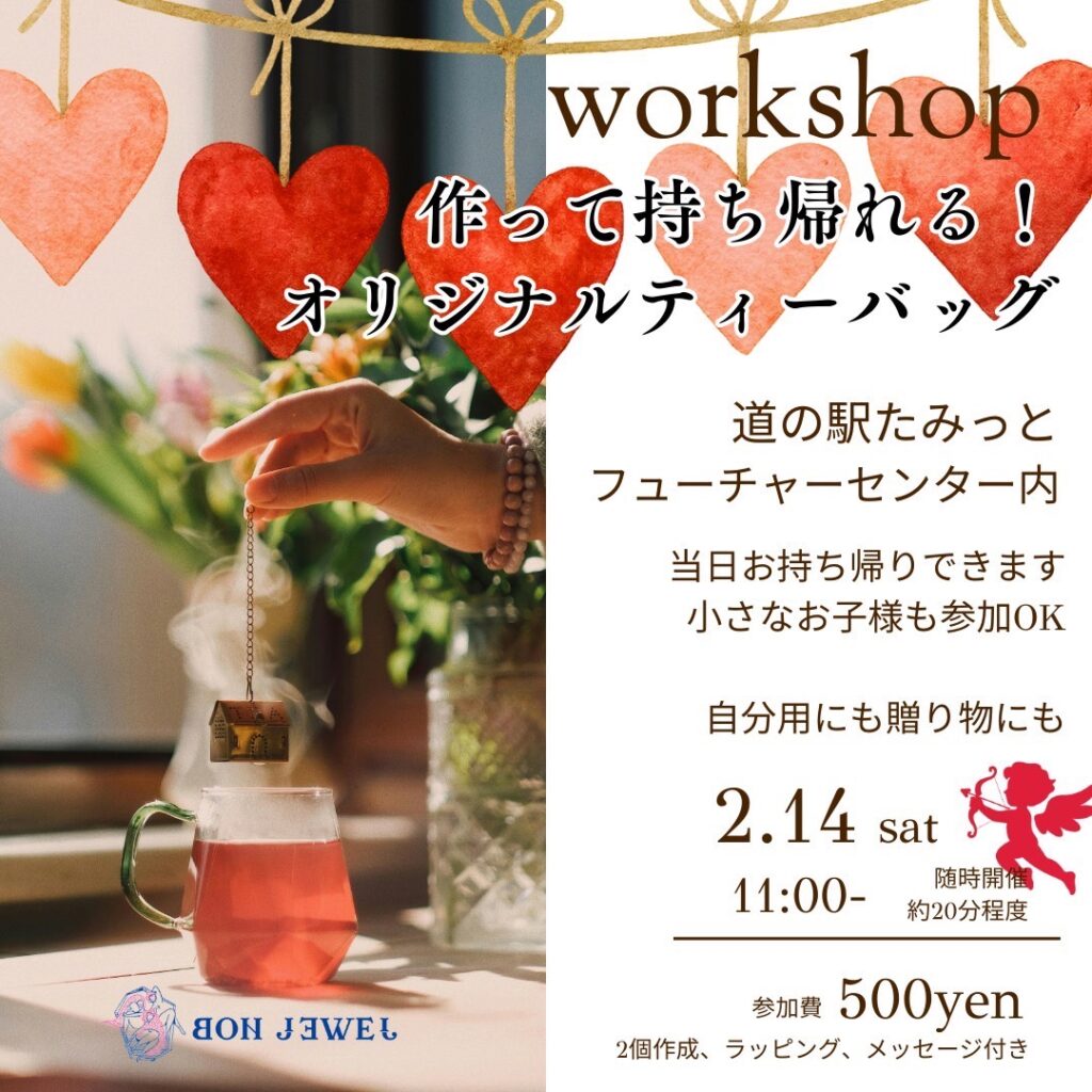 【参加者募集!】2月14日開催!BON JEWEL 作って持ち帰れるオリジナルティーバッグ体験